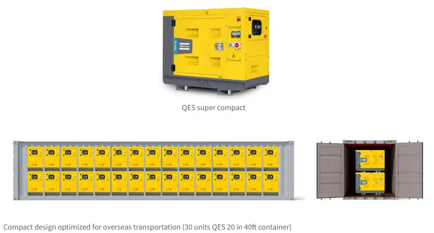 Mô hình QES siêu nhỏ gọn cải tiến được thiết kế để mang lại khả năng vận chuyển hiệu quả nhất. Bạn có thể chứa tối đa 30 đơn vị Atlas Copco QES 20 trong một thùng chứa 40 feet, nhiều nhất đối với Máy phát điện Atlas công suất 20kVA trên thị trường! Điều đó có nghĩa là vận chuyển được tối ưu hóa, giảm lượng khí thải CO2 và chi phí vận hành, dẫn đến Tổng chi phí sở hữu (TCO) thấp hơn. Thiết kế thân thiện với môi trường của nó khiến nó trở nên lý tưởng cho việc lưu trữ ở nước ngoài, giảm đáng kể dấu chân của bạn tại chỗ.