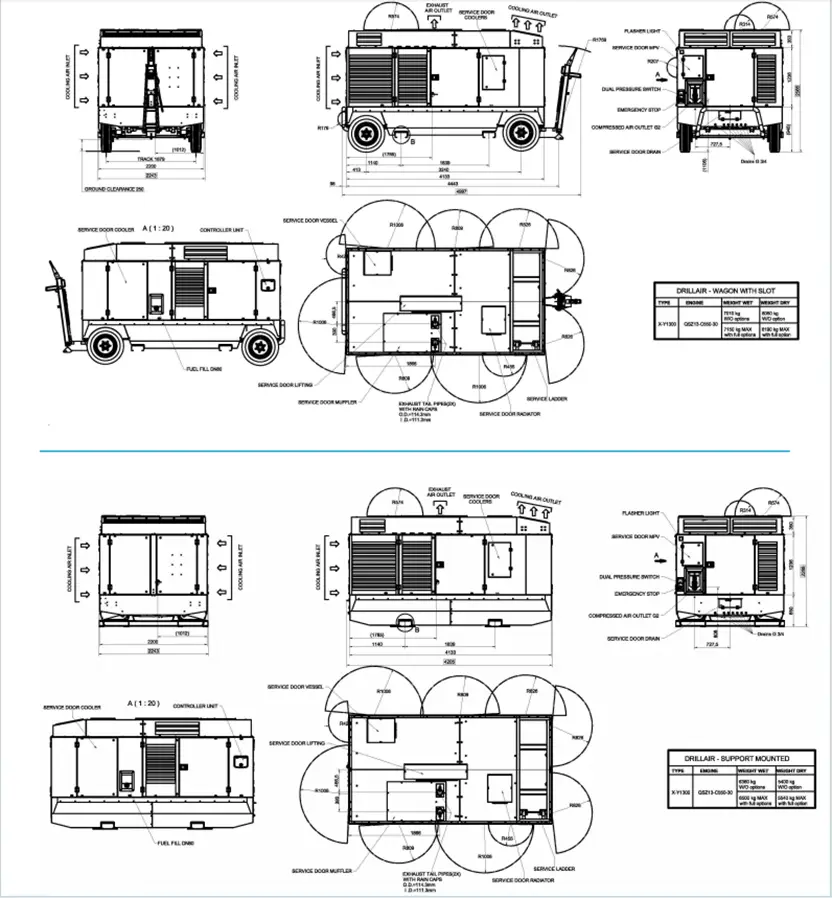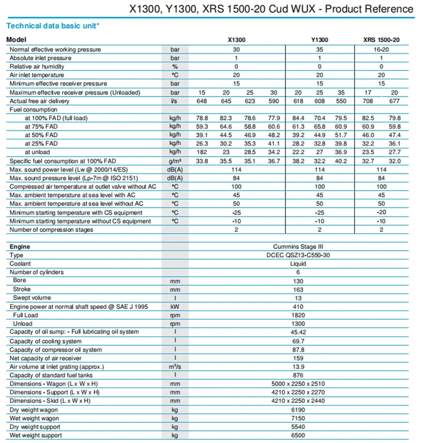 Atlas Copco X1300, Y1300 và XRS 1500-20 là máy nén trục vít phun dầu hai giai đoạn im lặng, chạy bằng động cơ diesel Cummins sáu xi-lanh, làm mát bằng chất lỏng.