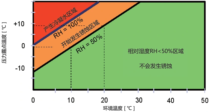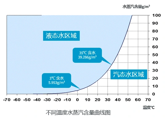 Hình vẽ cho thấy không khí chứa lượng hơi nước khác nhau ở các nhiệt độ khác nhau. Không khí nguội đi và lượng hơi nước trong nó cũng giảm theo. Đường cong có các điểm đánh dấu mức hơi nước bão hòa. Nhiệt độ của mỗi điểm này là điểm sương. Điểm sương thấp hơn có nghĩa là ít hơi nước trong khí nén hơn. Máy sấy khí lạnh sử dụng quy tắc vật lý này. Họ để khí nén trao đổi nhiệt với chất làm lạnh. Hành động này làm giảm nhiệt độ của khí nén. Hơi nước của không khí được làm mát biến thành nước lỏng. Chất lỏng này được thoát ra khỏi hệ thống. Ví dụ, hàm lượng hơi nước bão hòa của khí nén ở 35oC là 39,286 g/m³. Sau khi trao đổi nhiệt với môi chất lạnh và làm mát đến 3oC, hàm lượng hơi nước bão hòa là 5,953g /m³. Chênh lệch 33,333g /m³ cho biết lượng nước được loại bỏ sau khi làm mát và khử nước bằng máy sấy đông lạnh. Nghĩa là, sau khi khí nén đi qua máy sấy đông lạnh, khoảng 85% độ ẩm sẽ được loại bỏ, đảm bảo quá trình sấy khí nén đáp ứng yêu cầu của quy trình sản xuất.