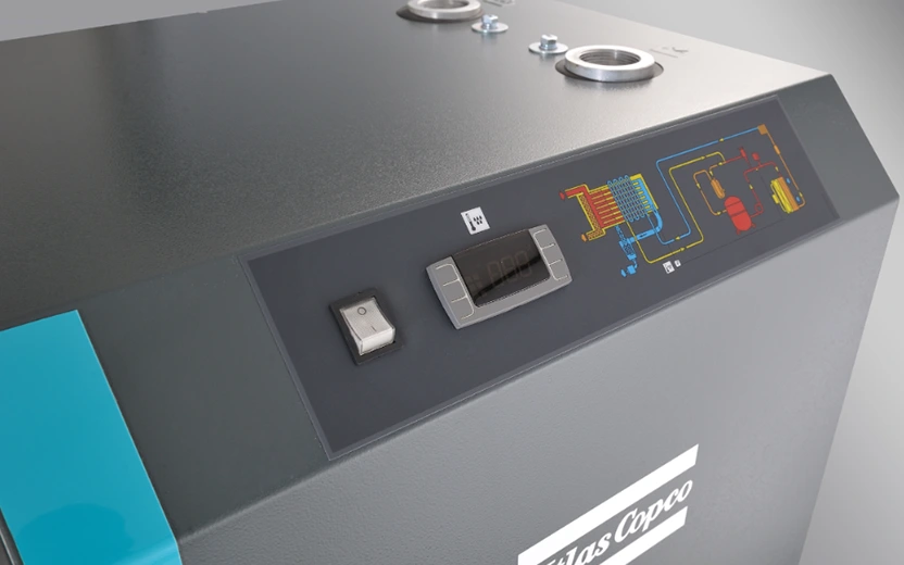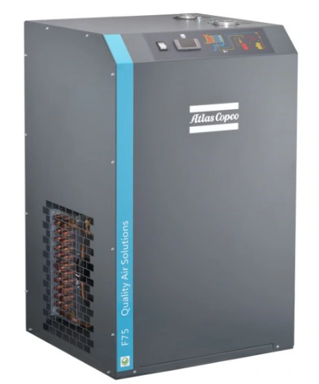 Máy sấy không khí lạnh loại F của Atlas Copco sử dụng bộ trao đổi nhiệt ba trong một kết hợp bộ tách không khí/không khí, không khí/chất làm lạnh và nước. Điều này loại bỏ hiệu quả nước lỏng tách ra sau khi làm mát và làm mát trước khí nén, cải thiện hiệu suất trao đổi nhiệt.