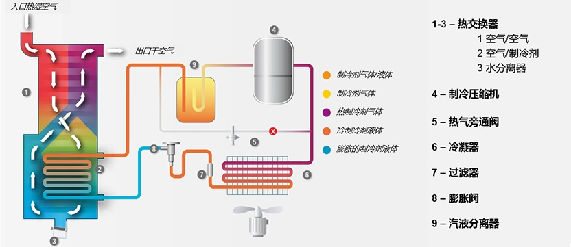 Máy sấy không khí lạnh loại F của Atlas Copco sử dụng bộ trao đổi nhiệt ba trong một kết hợp các bộ tách không khí/không khí, không khí/chất làm lạnh và nước. Điều này loại bỏ hiệu quả nước lỏng tách ra sau khi làm mát và làm mát trước khí nén, cải thiện hiệu suất trao đổi nhiệt. Đồng thời, nó làm nóng khí nén khử nước đến nhiệt độ thấp hơn 10°C so với nhiệt độ đầu vào, đảm bảo độ ẩm tương đối của khí nén sau khi xử lý dưới 50%, ngăn ngừa ăn mòn và đạt được hiệu quả khử nước thực sự của máy sấy không khí làm lạnh.