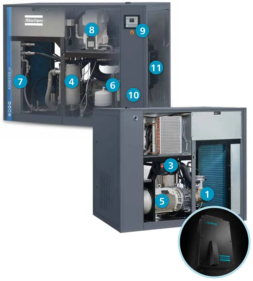 Công nghệ AQ VSD của Atlas Copco theo dõi những thay đổi trong việc sử dụng khí của khách hàng và điều chỉnh tốc độ máy nén theo thời gian thực, đạt mức tiết kiệm năng lượng trung bình lên tới 35% và tiết kiệm tổng chi phí vòng đời khoảng 22%.